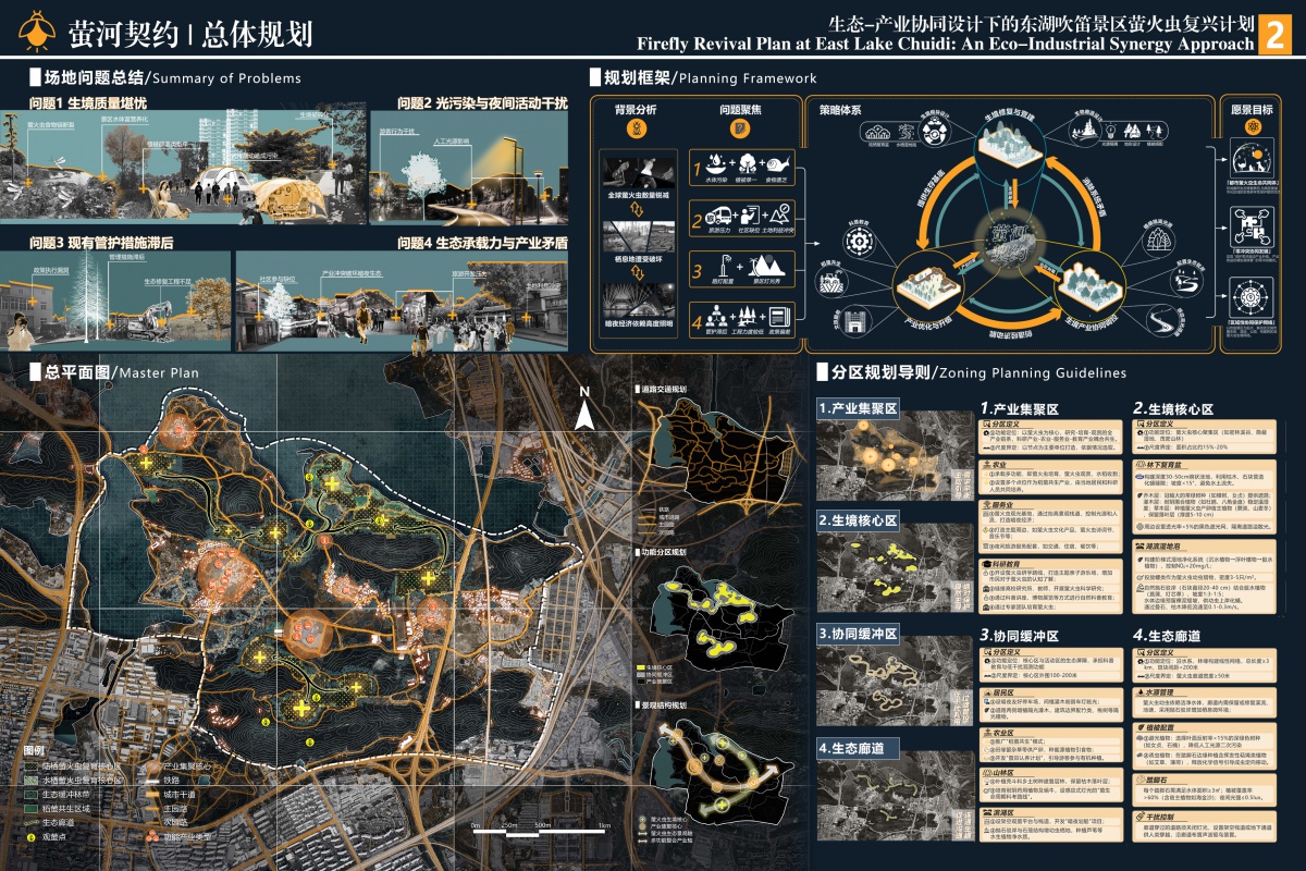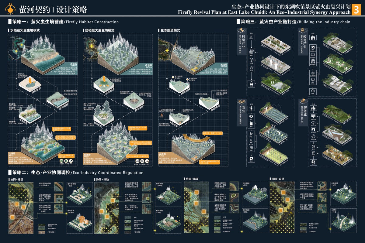 该设计聚焦武汉东湖萤火虫复兴,创新构建 “生态 - 产业 - 公众” 协同体系,生境修复与产业转化策略突出,可视化与叙事逻辑清晰,为城市核心区生物多样性保护与可持续发展提供了兼具技术创新与社会价值的实践范式。