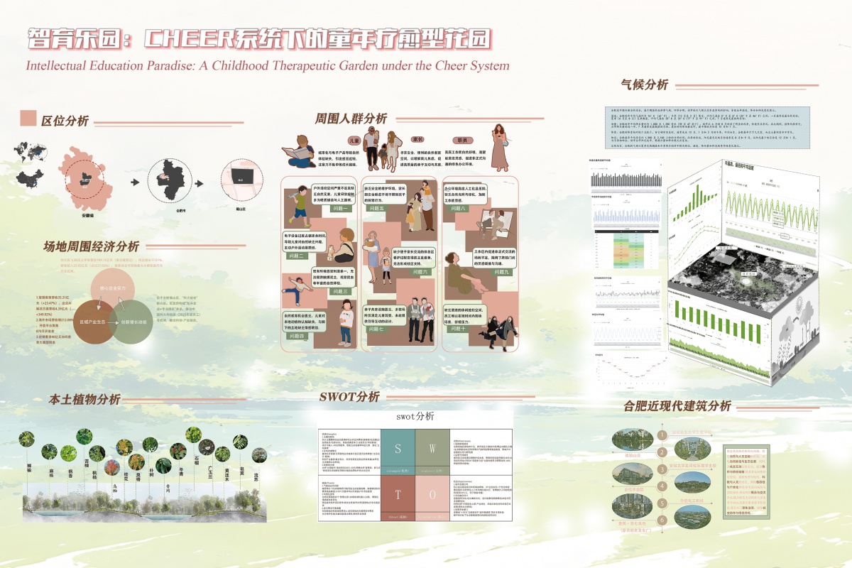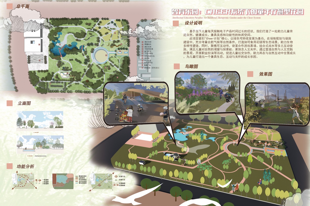 “CHEER"系统含有创意,从儿童的视角探讨多元视角的疗愈花园。设计深度不佳,未能充分展示设计理念。