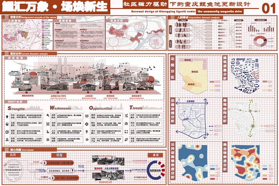 展示鲤鱼池片区的区位条件、人口需求、功能分区及交通流线等现状基础数据。通过SWOT分析与核心问题梳理,揭示设施短缺、空间失活、交通不便等主要矛盾,为更新设计奠定依据。