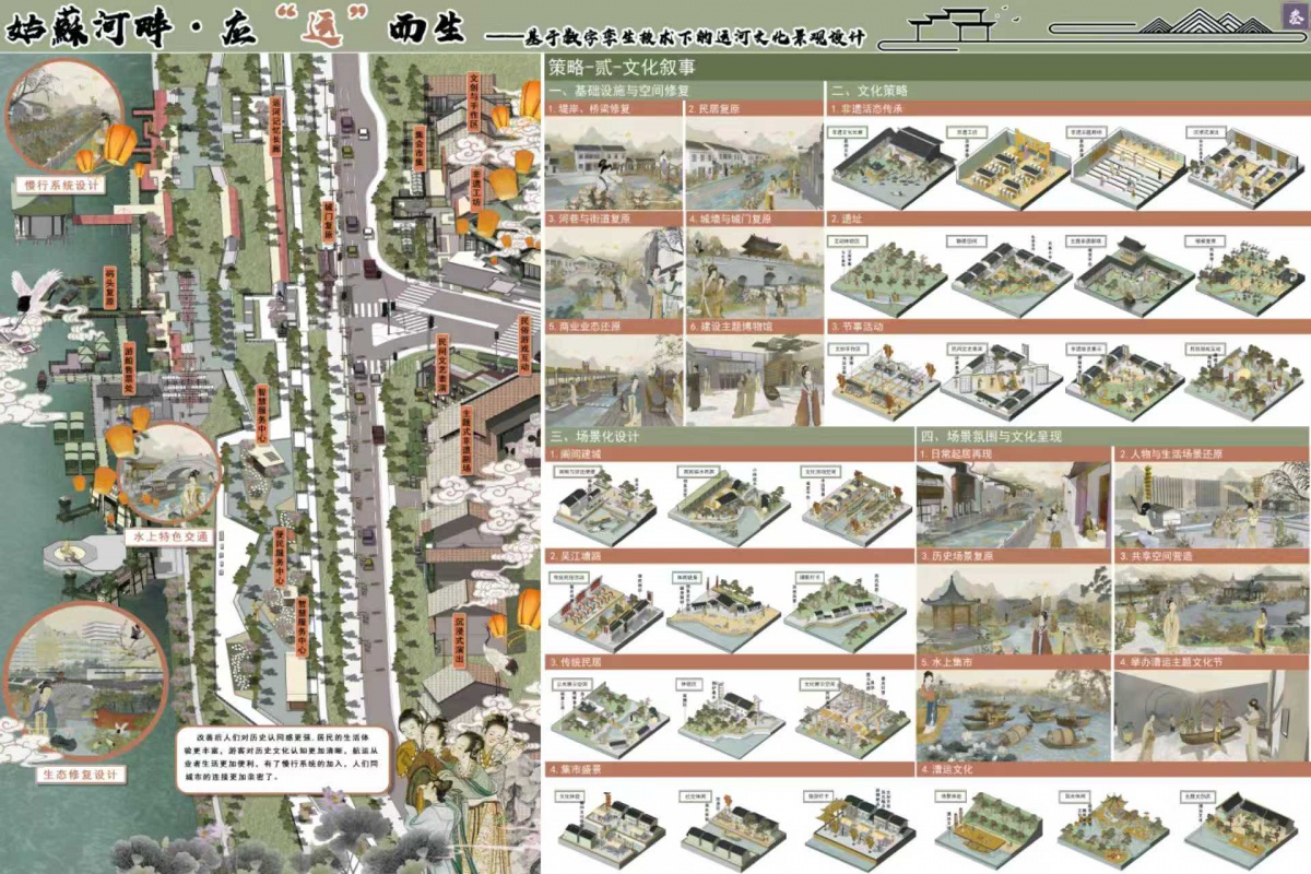 展板四主要包括设计策略中的数字赋能以及功能激活。苏州构建 “古城数字孪生 + 元宇宙建设” 数字化保护体系,智慧数据平台包括智慧航运管理,智慧生态保护,智慧旅游安防,智慧文化保护。