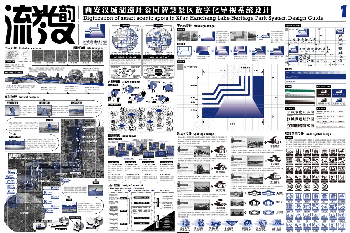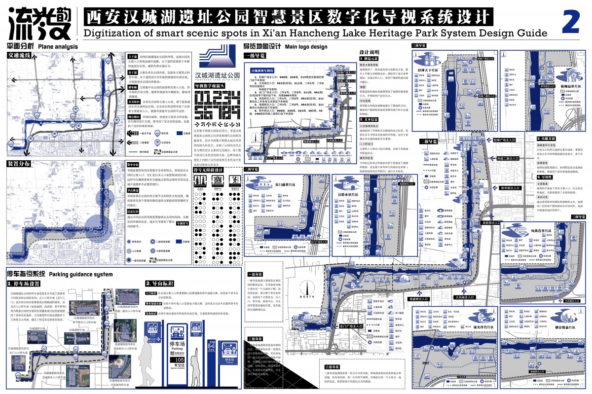 本设计深度融合西安汉城湖遗址公园历史文化与智慧景区需求,从历史、场地、人群多维度分析,提取特色元素转化为导视符号,打造科学系统且具文化辨识度的数字化导视系统,既提升游览体验,又助力文化传播,实现文化性与智慧化的良好结合。