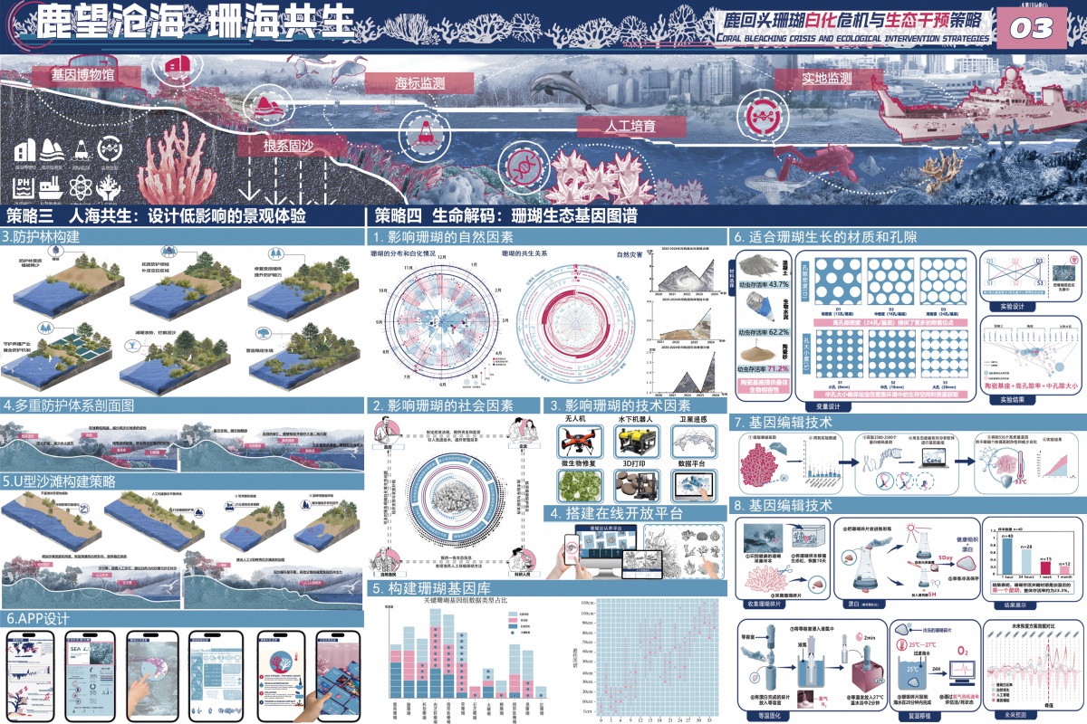 该设计聚焦鹿回头珊瑚白化危机,创新构建 “生态 - 技术 - 人文” 融合策略,珊瑚基因图谱与数字化平台技术突出,可视化与叙事逻辑清晰,为珊瑚礁生态修复与基因级保护提供了兼具科学突破与社会价值的实践范式。