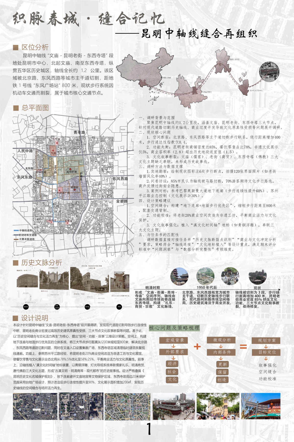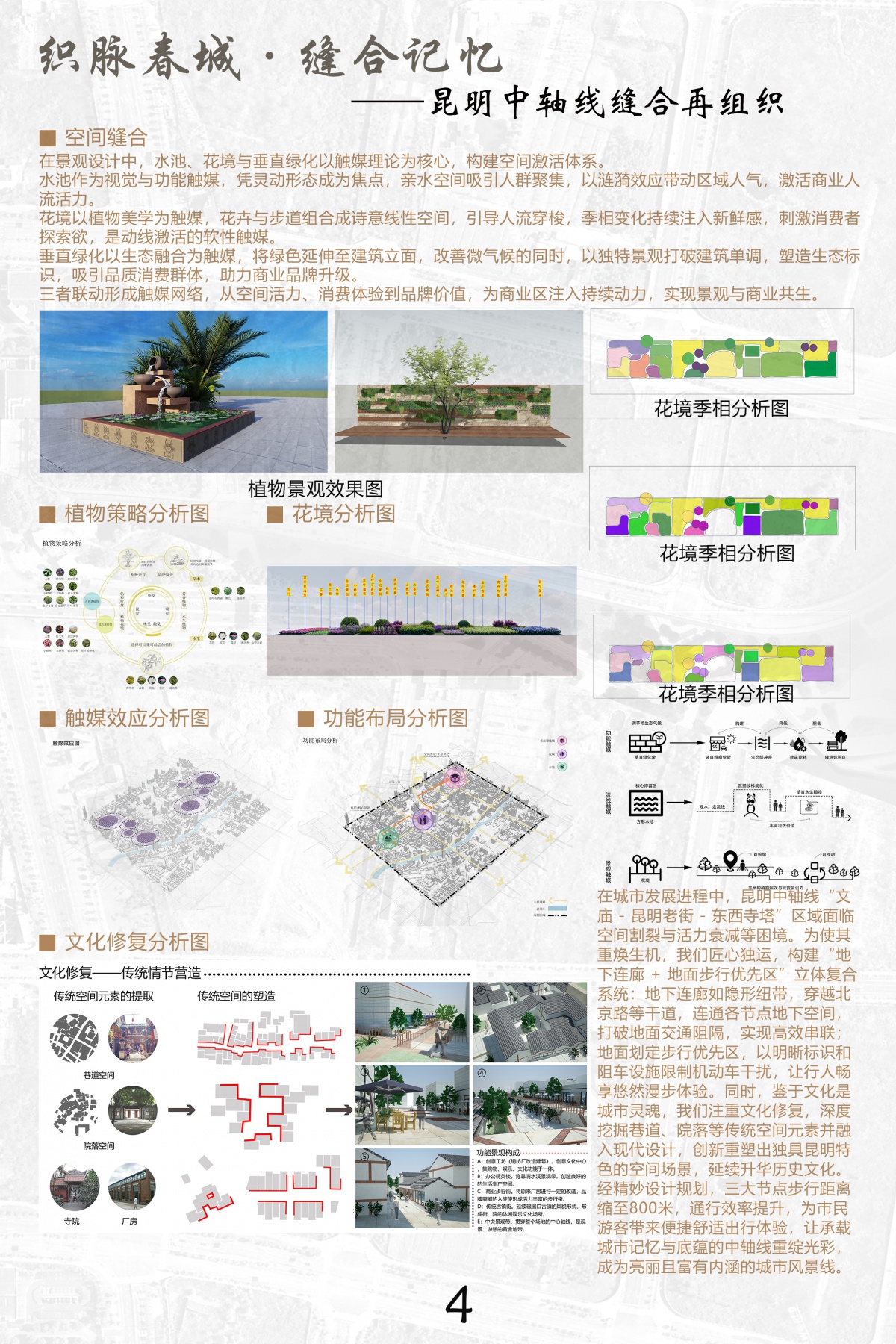 该设计以“织脉春城·缝合记忆”为理念,通过“滇文化时间轴”串联文庙、昆明老街、东西寺塔等历史节点,植入青铜浮雕、灯光导视等装置构建文化叙事体系;运用智能交互装置等施工技术打造AI交互广场,打破空间边界,实现历史与现代科技融合;亮点在于以人群行为、群体、构成分析为基础,既通过文化地标激活历史空间生命力,又以智慧场景重塑“传统+未来”的空间叙事,推动城市中轴线历史与现代的有机缝合。