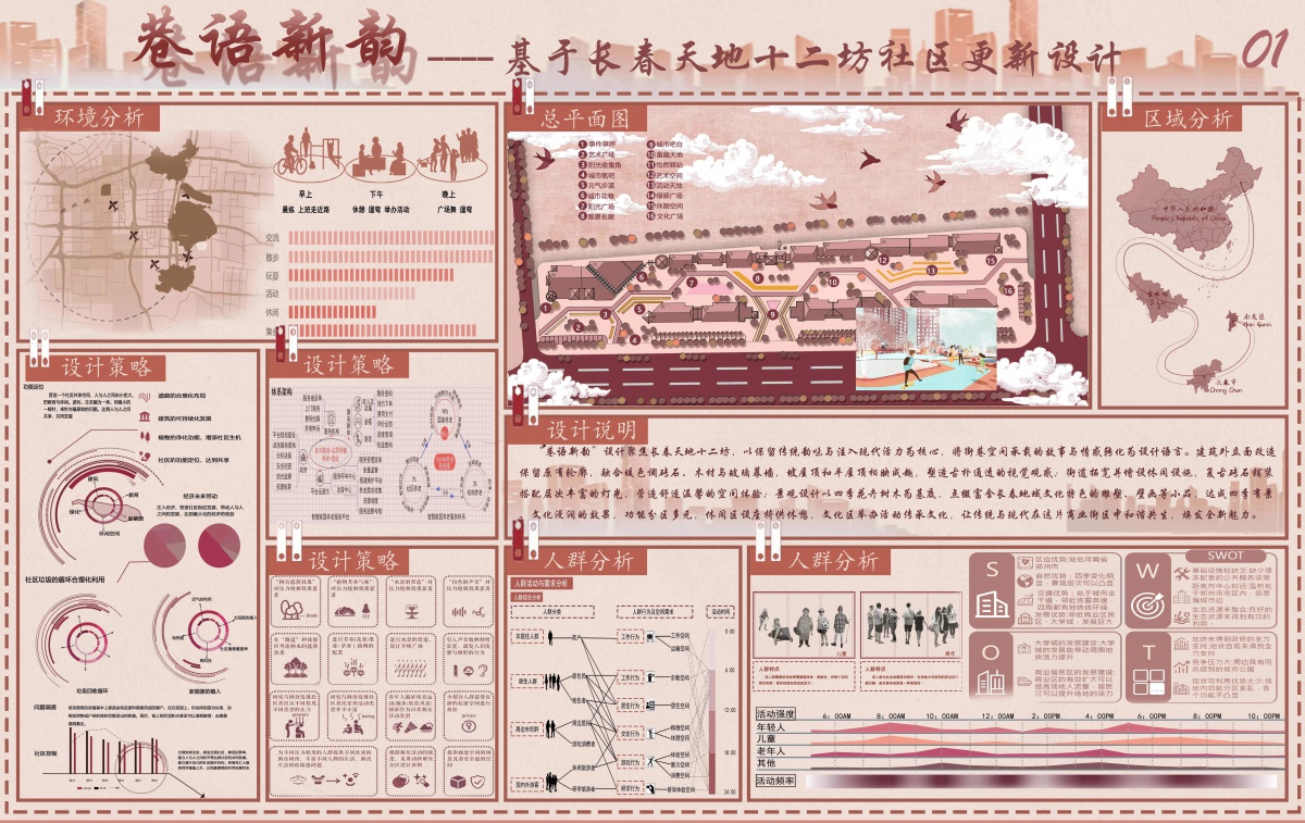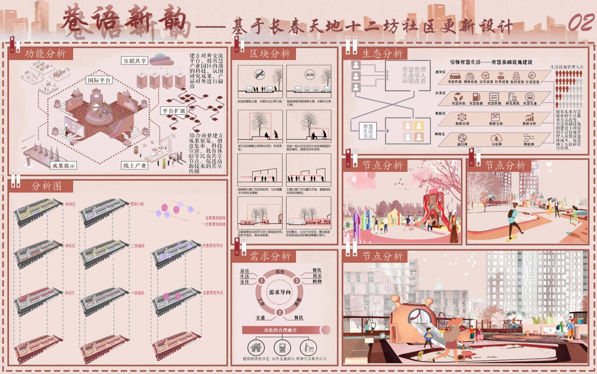 文化与现代融合,深度挖掘长春天地十二坊地域文化内涵,将传统元素巧妙融入现代社区空间设计,如在建筑风格、景观小品等方面体现,使社区既具历史文化底蕴,又符合现代生活审美与需求。空间功能多元,进行细致的功能分区,涵盖休闲、交流、运动等多种功能区域,且各区域通过合理的空间设计实现有机衔接,满足不同年龄段、不同需求居民的活动需求,为社区注入满满活力。生态景观营造,精心挑选本土植物,构建层次丰富、季相变化明显的植物景观,同时结合生态分析,打造出生态友好型社区环境,提升社区的生态价值与宜居性。视觉呈现出色,借助鸟瞰图、效果图、剖面图等多种表现形式,生动且直观地展现出社区更新后的空间形态、景观效果与使用场景,让设计方案更具吸引力与感染力,便于他人理解设计意图。