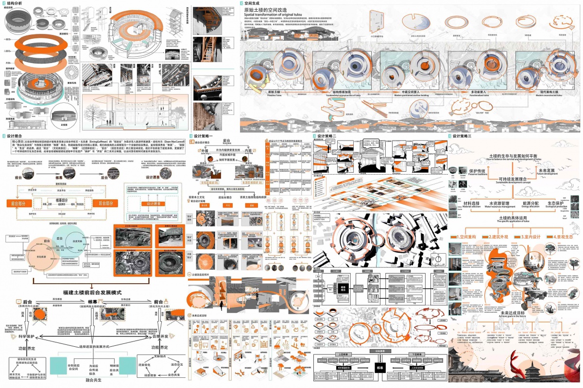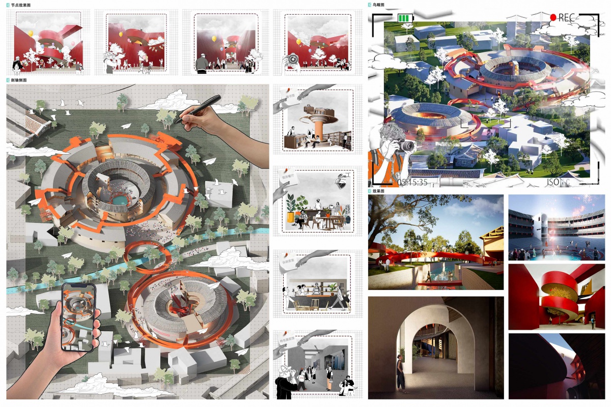 本展板聚焦项目视觉与场景呈现了节点效果图旋转楼梯、图书馆、茶馆、博物馆刻画空间细节,剖轴侧图解析建筑构造逻辑,鸟瞰图展现整体布局,五张室外效果图呈现建筑与环境的融合场景,全方位展示土楼改造后的视觉张力与多元空间体验。