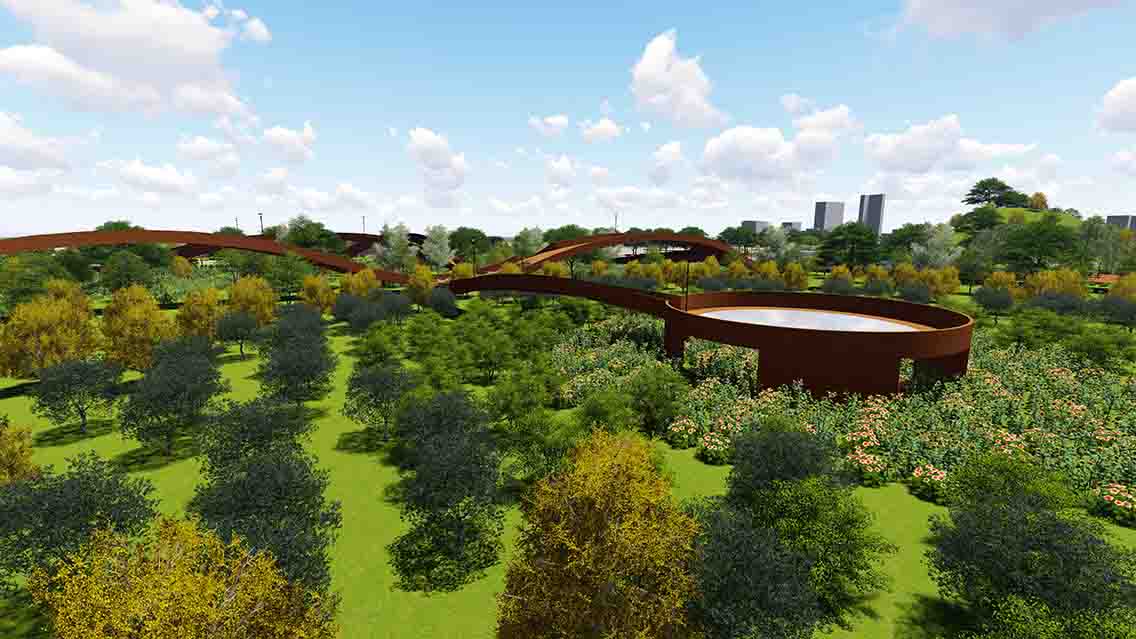 图片描述:由生命之源的人工湖延伸出来的木质道路形成自然之路,自然之路的外框是由灌木沿着爆炸的痕迹种植的,在阻挡人们前进的同时又不会阻挡视野。